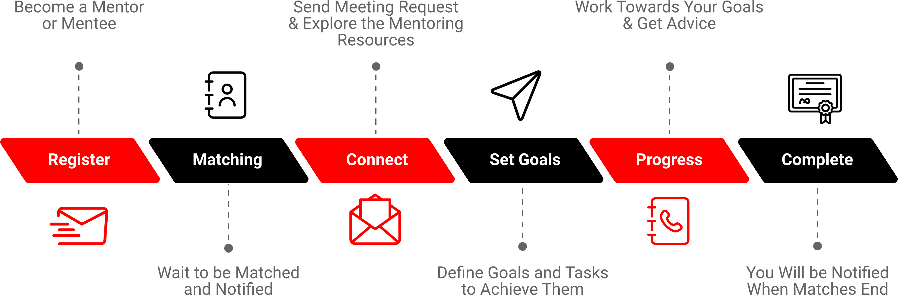 * Apply to be a mentor or mentee * If approved you will be notified * Once matched, login to your dashboard * Connect with your match * Follow the Mentoring Checklist * Read the Mentoring Resources * Take notes in your Journal * Define Goal/s, Tasks and get Feedback * Complete Surveys over time